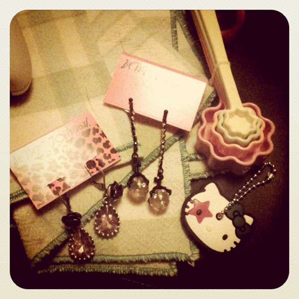 | Some shopping from previous days; the baking spoons from a shop on Hawthorne, Betsey Johnson earrings from The Rack, can't remember where I got the Hello Kitty key decoration from. |